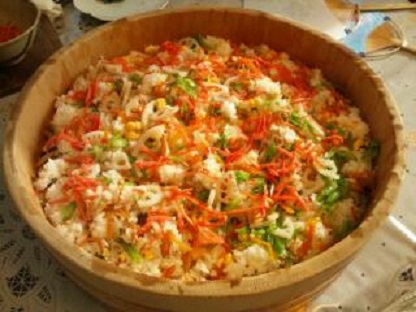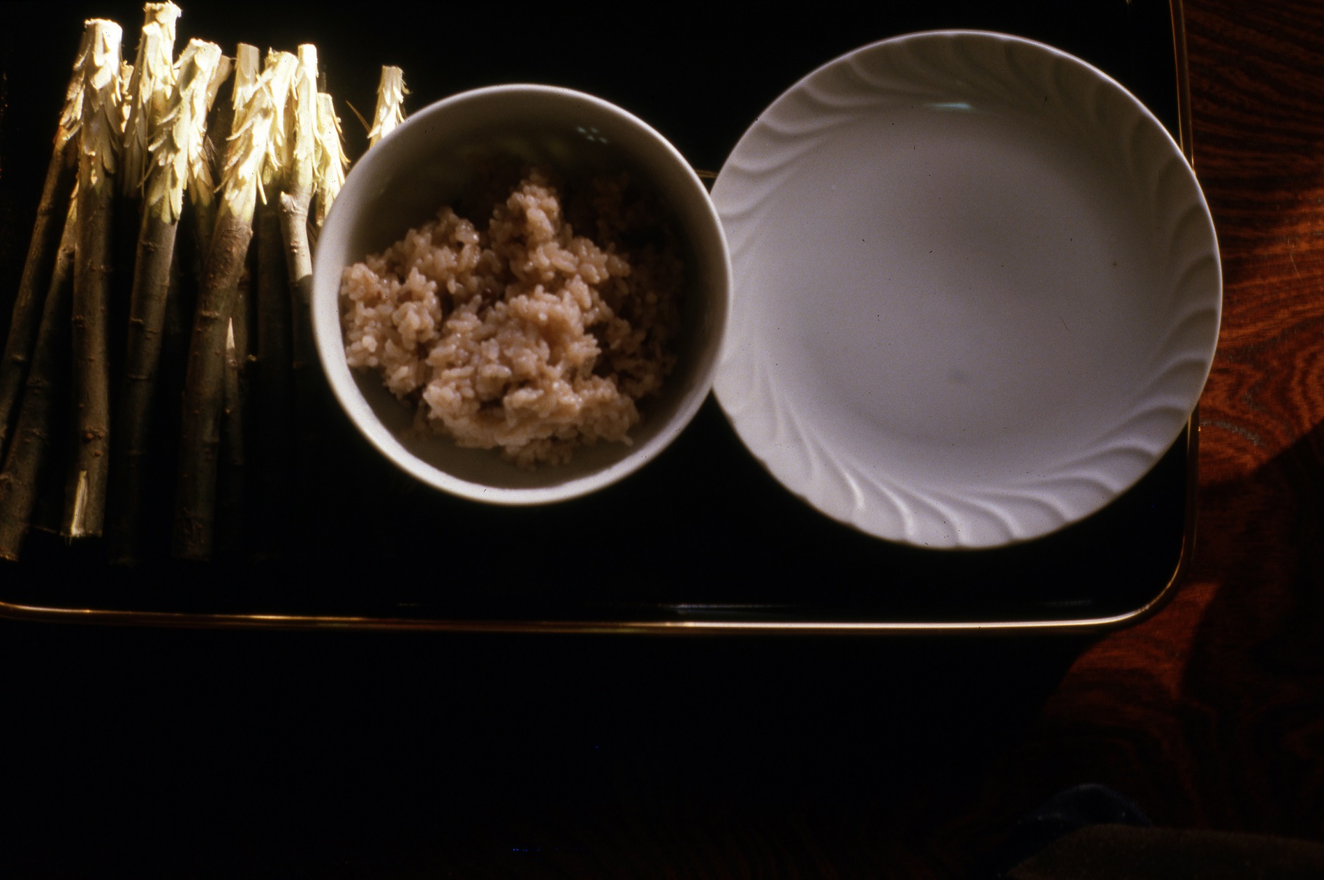 15日の朝は小豆を米を炊いた小豆粥を作る。この小豆粥は柳の木を20㎝ぐらいに切り、両端を削って粥がからまるようにした柳箸と呼ばれるものを作り、神棚にお供えした。この小豆粥を残しておき、18日に食べると毒虫に刺されないとか目が悪くならないといった。