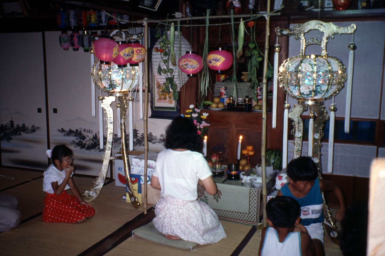 新盆の家ではこの日の早朝、まだ太陽の光が差し込む前に高灯籠といって、庭先に丸太を立て、杉の葉をつけて灯籠をつるした。そして、仏様が迷わないようにと、送り盆まで毎日灯籠に火を灯した。親戚の人たちは新盆見舞いとして、白い提灯やそうめんなどを持って行く。この贈答品のことを「ボンブチ」といっている。