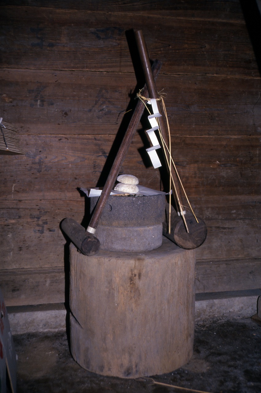 餅つきが終わると臼と杵はきれいに洗い、臼の上に粉ひきにつかう石臼を置き、供え餅を供え、杵をぶっちがえにして飾る。こうした飾りは年が明けて1月11日に「蔵開き」と呼ばれる行事が行われるまで置いておく。