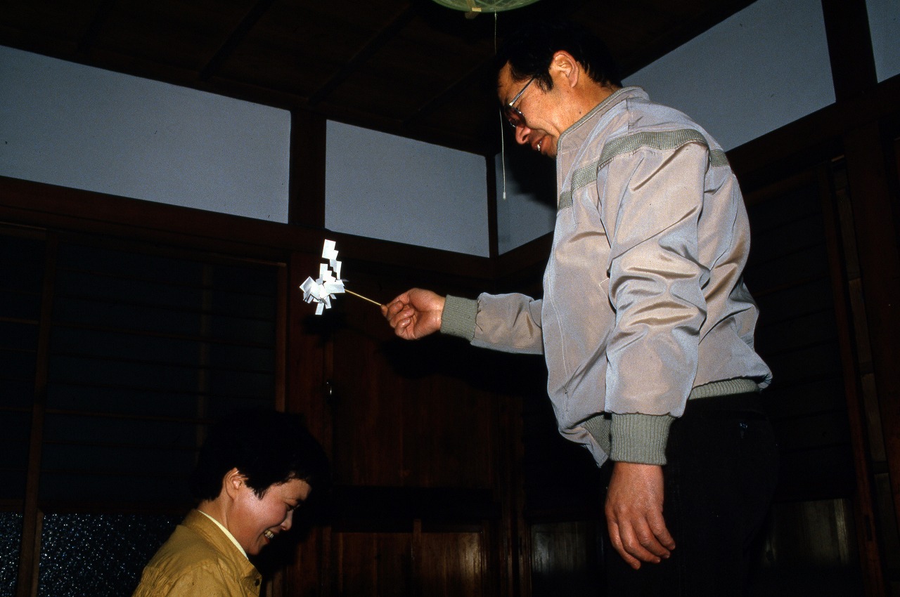 いた。暮れになると神社の総代や世話役から神棚に飾る神札とともに小さな幣束が配られる。大晦日の夕食が終わるとこの小さな幣束を一家の主人が手に持ち、家族の頭の上を「祓い給え、清め給え」といいながら祓って回る。事情があって正月に家に帰れない家族は着物を用意してその上を祓う。すべての家族の祓いが終わったあとは幣束を家の近所の辻(三叉路)にさしておく。