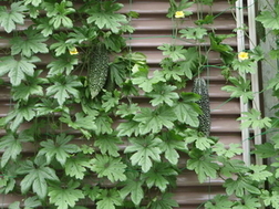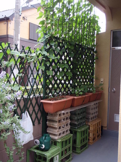 そして、ゴーヤは家の壁と塀の間のわずか約15cmのスペースですくすく育っていました。こちらも、塀の高さ近くまである台の上にプランターが載せられていました。はじめて見たとき、こんな小さなスペースでも工夫次第で立派なカーテンが育つと分かり、非常に驚きました。